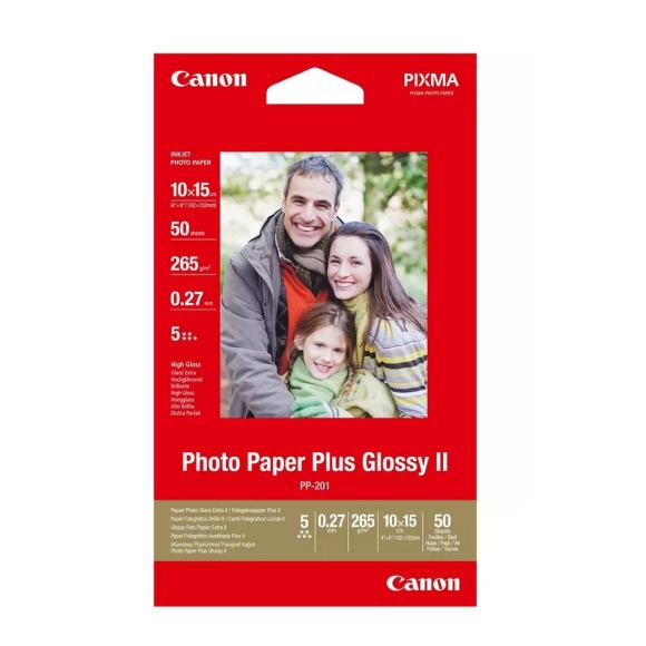 Canon PP-201 Glossy II Photo Paper Plus 4x6" – 50 Sheets. Features a high-gloss finish with a media weight of 260 g/m. Paper dimensions: 10 x 15 cm. Product colour: Red.